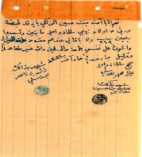 وثيقة آمنة بنت حسين بن محمد بن حيي(الزنكي) في حصولها على إرثها من زوجها محمد بورسلي عام ١٩١٣م