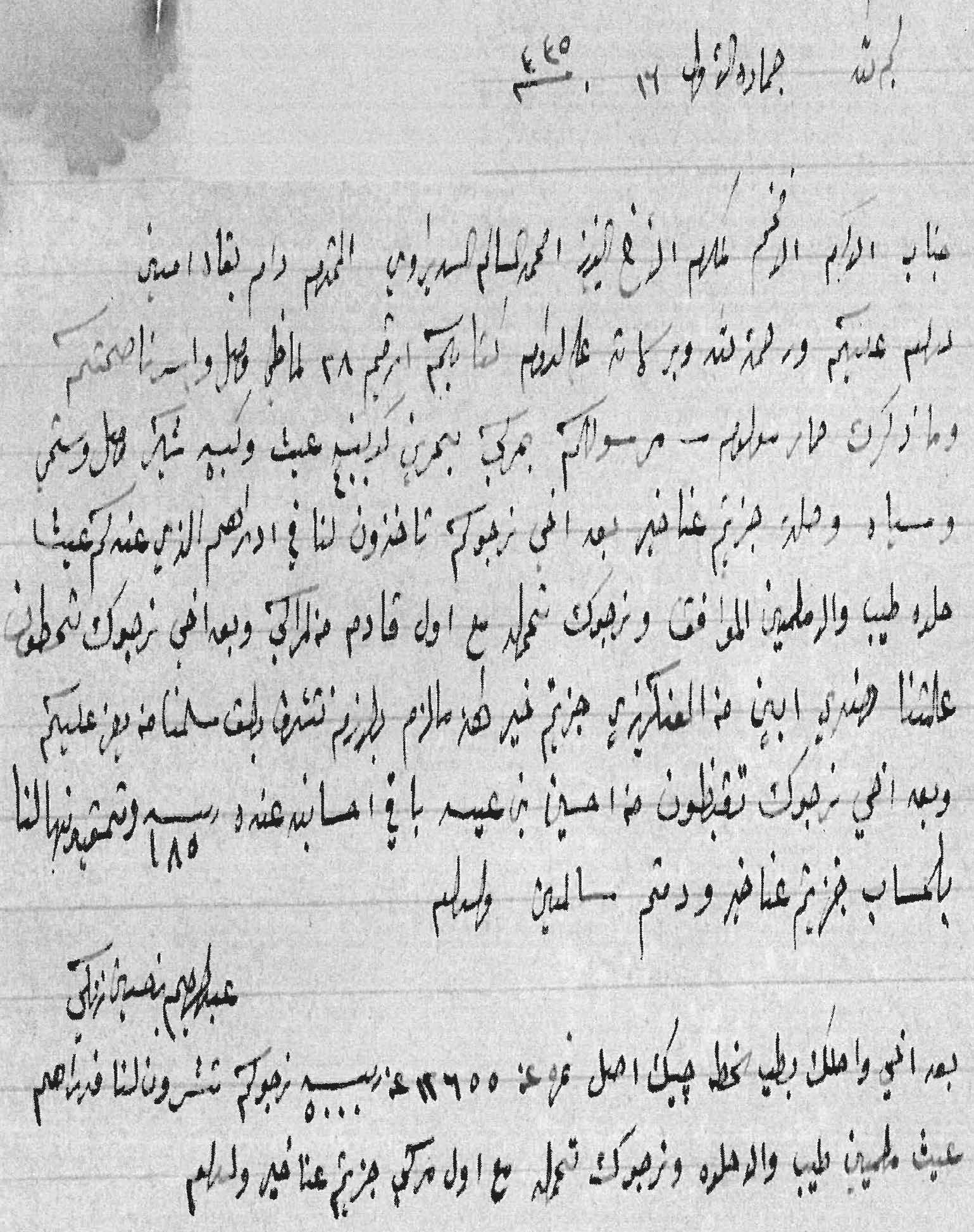 السلام عليكم ورحمة الله وبركاته على الدوام، كتابكم المرقم ٢٨ الماضي وصل، وأسـرنا صحتكم وما ذكرت صار معلوم مرسـولكم بمركب بحرين، ٤٠٠ كونية عيش، و٥٠ كيس شكر… وصلت جزيتم عنا خير.