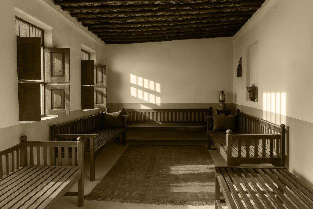 كانت المجالس -الـ«ديوانية»- بيتًا للناس قبل أن يكون بيتًا للسياسة أو الملك. يدخل الرجل ويحسّ بالراحة كما لو دخل دار أبيه، يُقدَّم له القهوة والتمر قبل السلام، ويبدأ الحديث عن السواحل والبحر والمحصول والجار. وللنساء مجالسهنّ أيضاً؛ جلساتٍ في البيوت تتبادل فيها النساء نصائحهنّ، تحافظن على أسرار العائلة، وتعلِّمن صغارهنّ آداب الضيافة وحفظ القرآن. كان لكل بيت مكانه في الحيّ، ولكل جار حقٌّ محفوظ، والاحترام كان لغةً لا تحتاج ترجمة